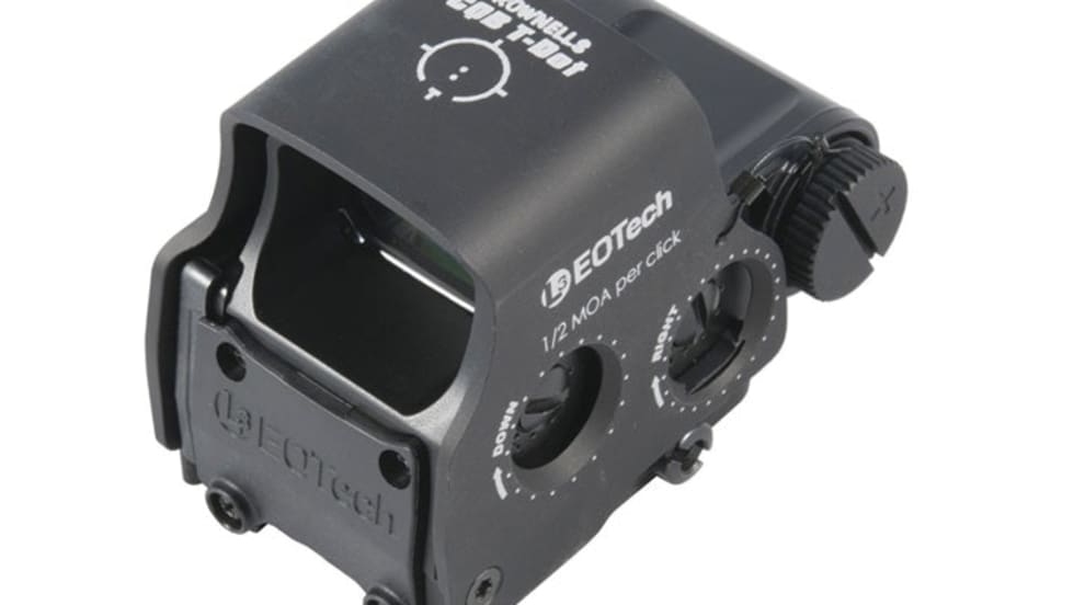 The new Brownells CQB T-Dot Holographic Sight pairs EoTech's EXPS2 battlesight with a custom-designed reticle to deliver fast aiming on targets closer than 10 yards and precise aiming for longer range targets.