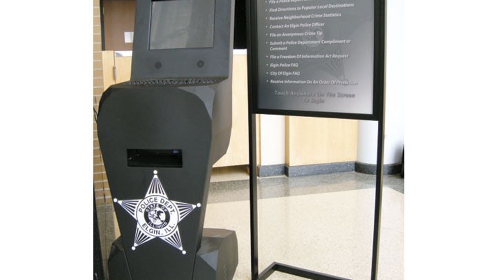 Entropy USA's e-Desk kiosk is the vision of a Chicago-area police detective to develop a more efficient way of handling citizen traffic inside police stations. The kiosk acts as an assistant to desk officers during high-traffic hours or when the front desk is closed.