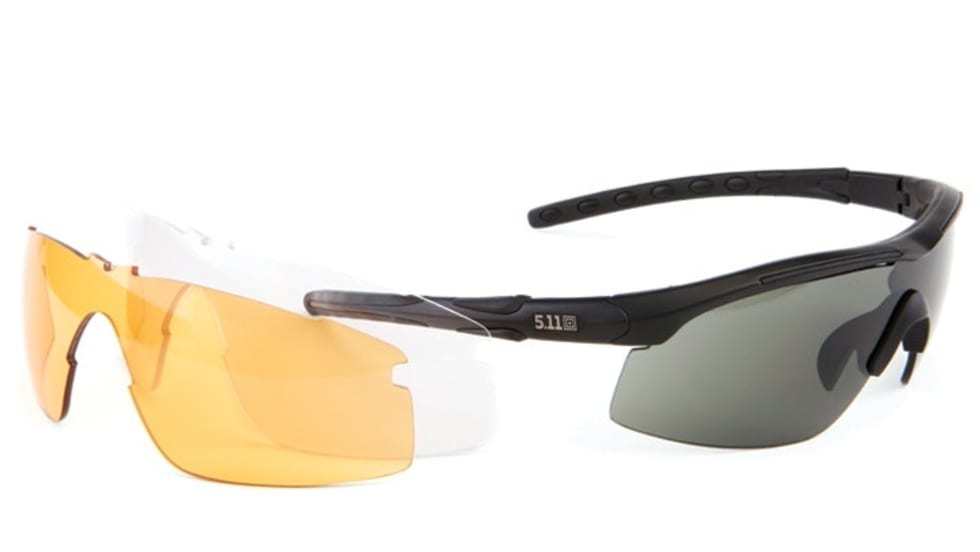 New Raid Eyewear from 5.11 comes with three easy-to-change lenses in smoke, ballistic orange, and clear. Molded inserts and an adjustable and padded nosepiece give stability and a superior fit.