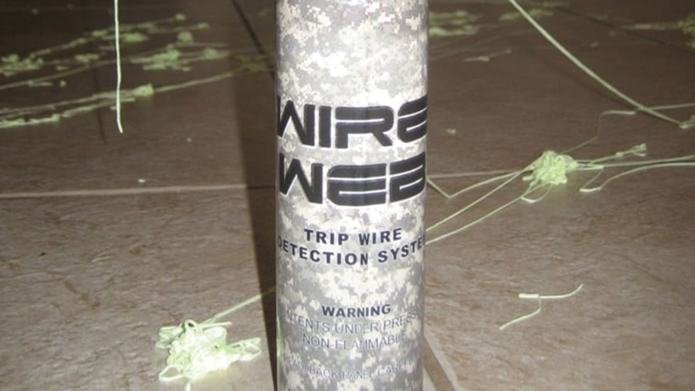 The Wire Web tripwire detection system was developed for police officers and soldiers who may have to navigate through a potential tripwire hazard. Spray the string across the intended pathway and the string will hang from the tripwires like icicles in midair.