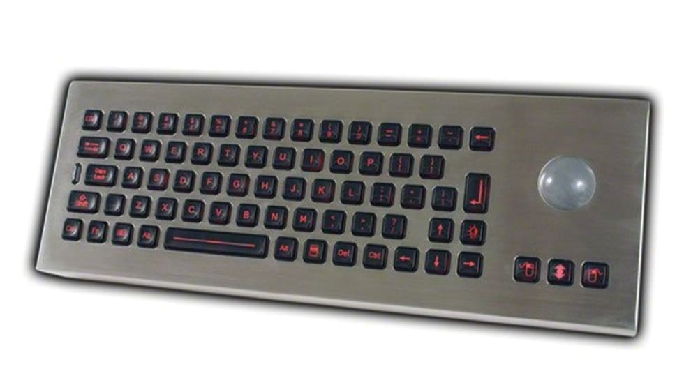 The Stealth model KYBX-400 series industrial-grade keyboard with built-in optical trackball is housed in a rugged vandal-resistant stainless steel enclosure and will stand up to harsh, wet, and dirty environments.