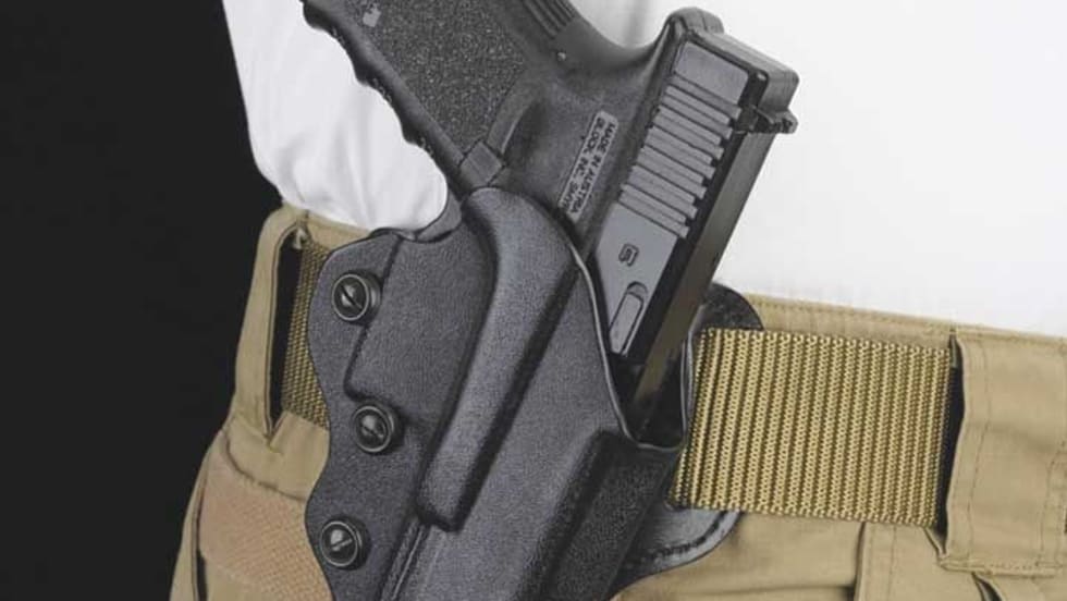 DeSantis' Facilitator style #042 holster is constructed of rigid .125 Kydex sheet and glass-reinforced nylon for strength and durability and features the company's Redi-Lok trigger locking device. The holster can be worn on the strong side (butt forward), cross draw (butt rearward), or at the small of the back (almost horizontal).