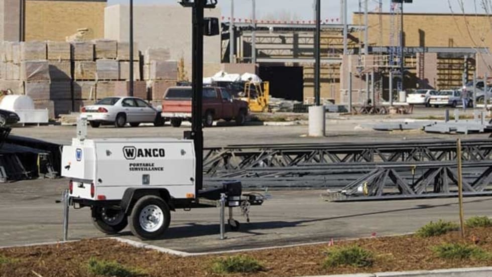 Wanco's portable surveillance trailer allows police to view and control cameras from a self-sustained remote location using a personal computer and an Internet connection. Pan-tilt-zoom cameras and an integrated digital video recorder make site monitoring easy. Users can control the cameras, access live and recorded video, and configure the equipment remotely or via the integrated control center. Up to four cameras can be mounted atop an electrically hoisted mast.