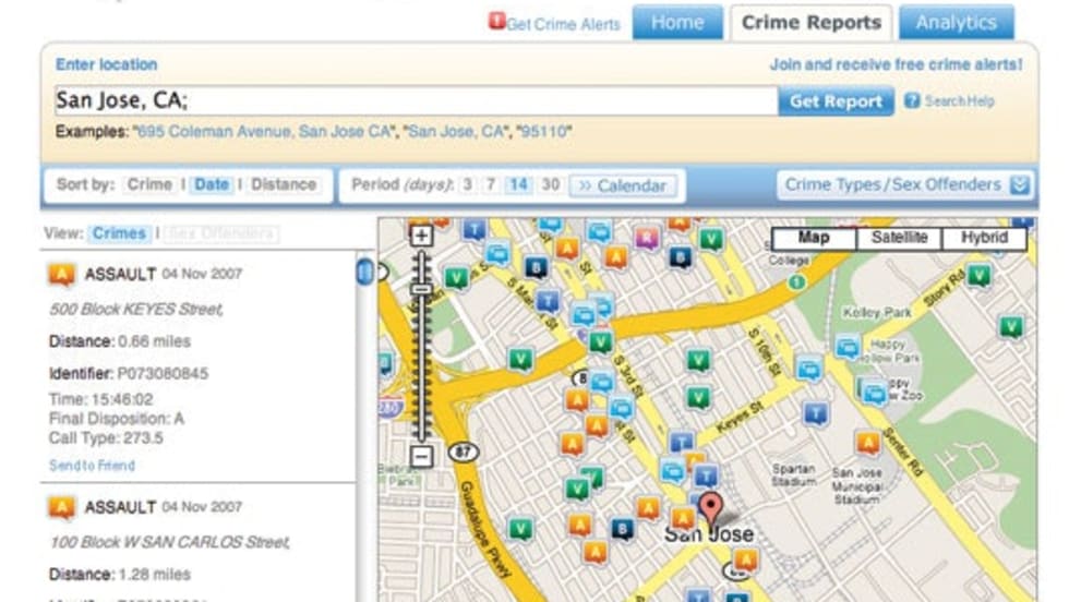 CrimeReports allows law enforcement agencies to provide neighborhood crime information to citizens in near real-time and empowers citizen participation in community policing. The service is free to the public and allows citizens to receive alerts automatically via e-mail when crimes occur within a specified distance of their homes.