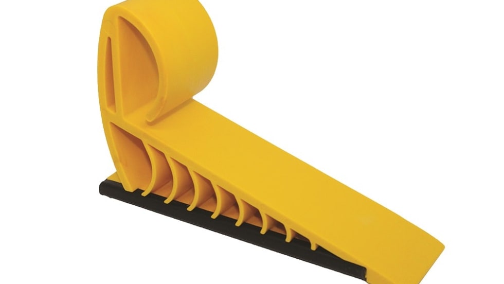 It’s a bright yellow doorstop with a hook for easy storage, covered on the bottom with a non-slip material hat grips any surface.