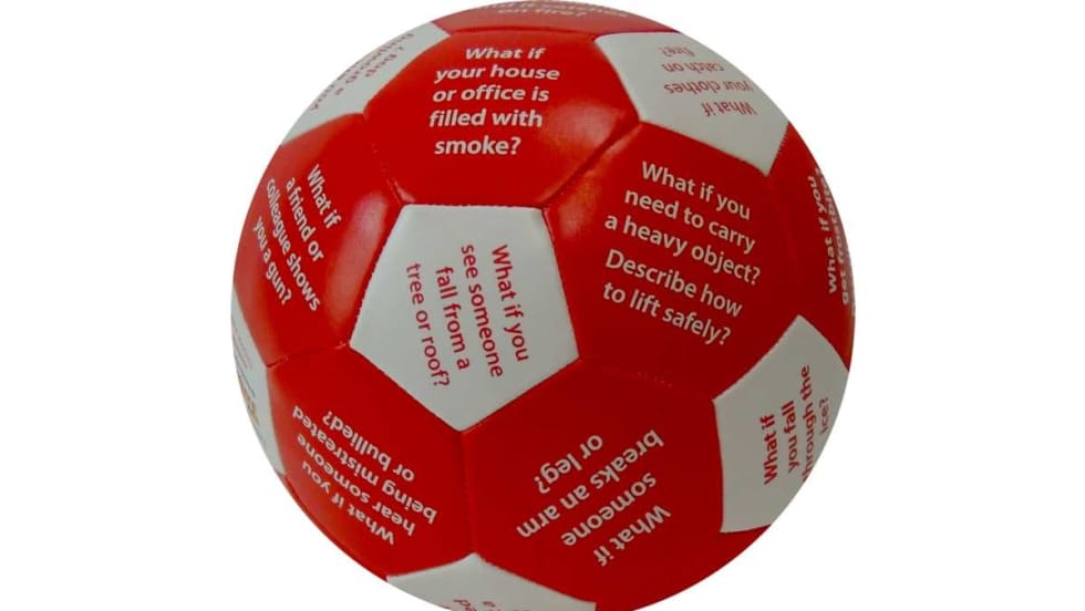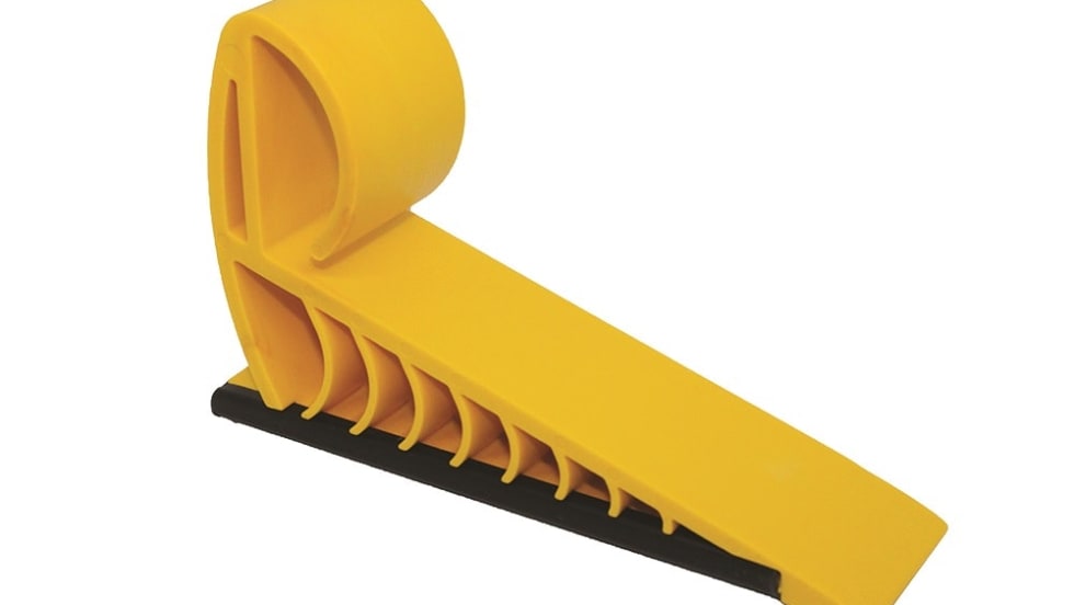 It’s a bright yellow doorstop with a hook for easy storage, covered on the bottom with a non-slip material hat grips any surface.