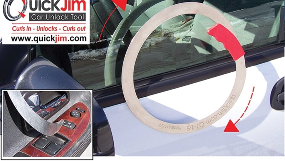 QuickJim is a new spiral tool that curls under a car's window to touch the unlock switch located on the armrest or door. QuickJim is designed to rotate out the way it went in and never get stuck.