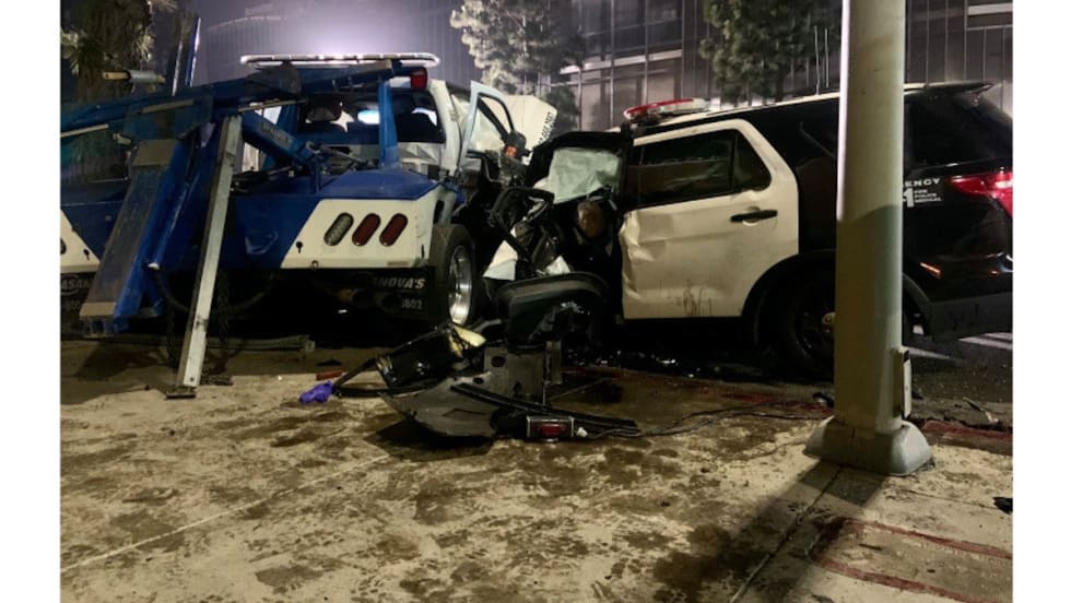 Video from the scene showed the LAPD SUV smashed against the rear passenger side of the tow truck, with a car and SUV also involved in the crash.