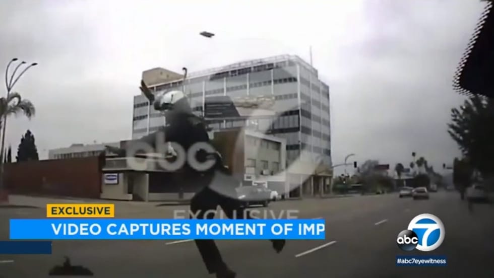 A motor officer with the Los Angeles Police Department was thrown from his motorcycle in a collision with an SUV and the entire event was captured on dramatic video.