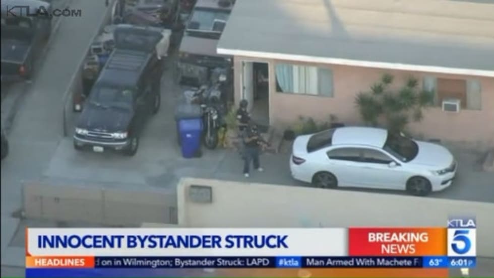 Two people were detained after shots were fired at Torrance, CA, police officers and a bystander was struck by gunfire in Wilmington on Wednesday afternoon, according to LAPD.