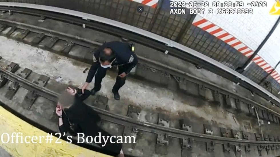 Authorities say the woman suffered a medical episode before she fell on the tracks Monday morning in Brooklyn. Two NYPD officers were walking slightly behind her when she collapsed.
