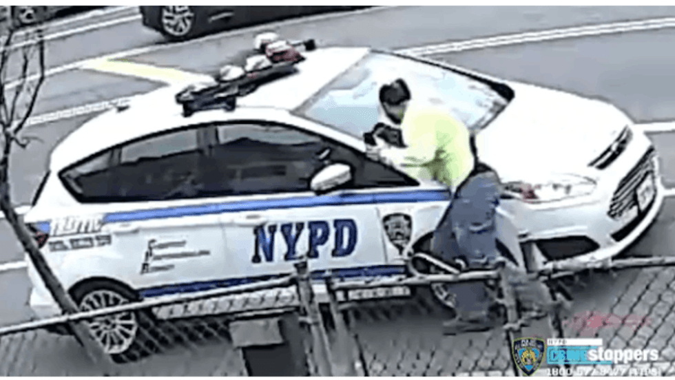 A man was seen on surveillance video attacking a New York Police Department patrol vehicle over the weekend.
