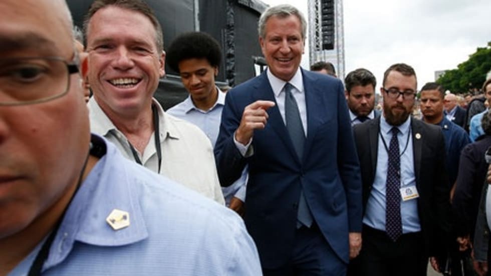 The demonstration of contempt was spurred by the mayor’s excursion to Germany to join anti-Trump protesters at the G20 summit one day after last Wednesday’s execution of 12-year NYPD vet Familia.