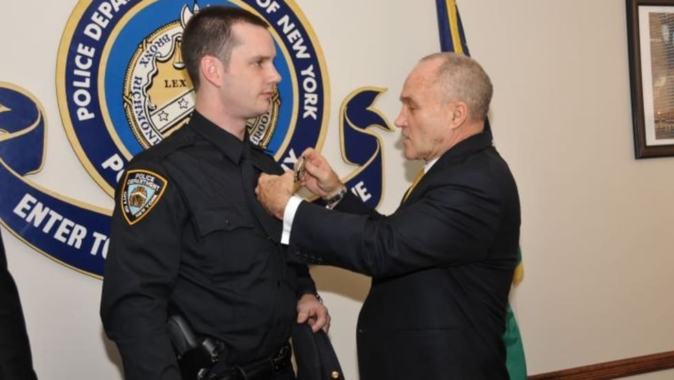 The sons of two NYPD officers received the shields that had been worn by Police Commissioner Raymond W. Kelly and ESU Officer Stephen Driscoll, who died in the 9/11 World Trade Center attacks.