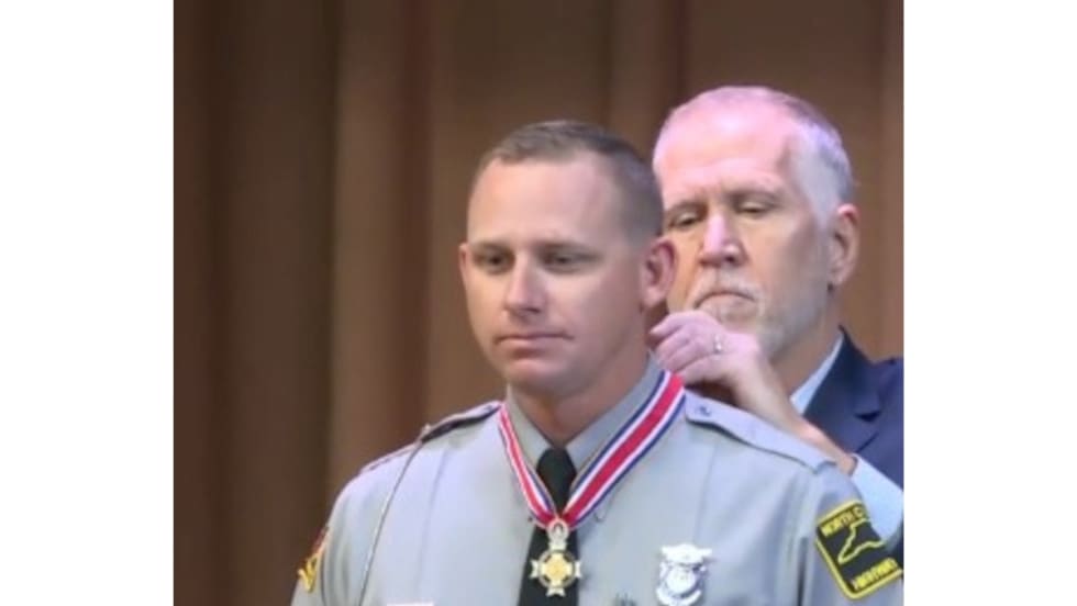 Trooper Daniel Harrell was shot in the face and neck. A suspect rammed his patrol car. Still, he continued pursuit until backup could arrive and make an arrest.