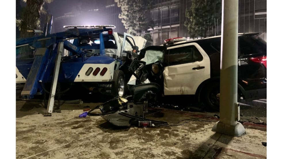 Video from the scene showed the LAPD SUV smashed against the rear passenger side of the tow truck, with a car and SUV also involved in the crash.