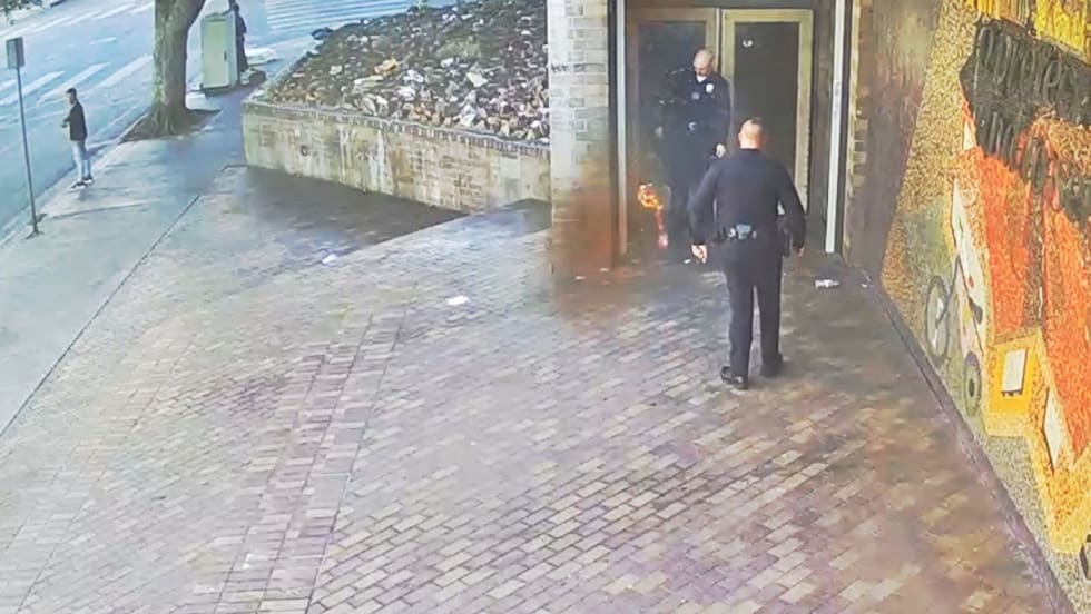 Video captured when a man started a fire outside a police station earlier this week and then was arrested by LAPD officers nearby.