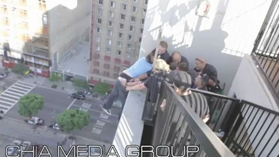 The man, who is in his 30s, was distraught over a breakup with his girlfriend. In footage captured by a bystander, the man can be seen dangling from the edge, as officers grab him by the jeans. As officers attempted to pull him to safety, he reportedly tried to bite the arm of the officer who was holding onto him.