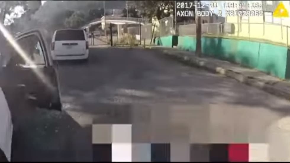 San Francisco Police Chief Bill Scott released body camera video and street surveillance footage Thursday night that shows Keita O’Neil, 42, jumping out of a stolen minivan and running by a patrol car as the officer fires through the glass window and O’Neil falls to the ground.
