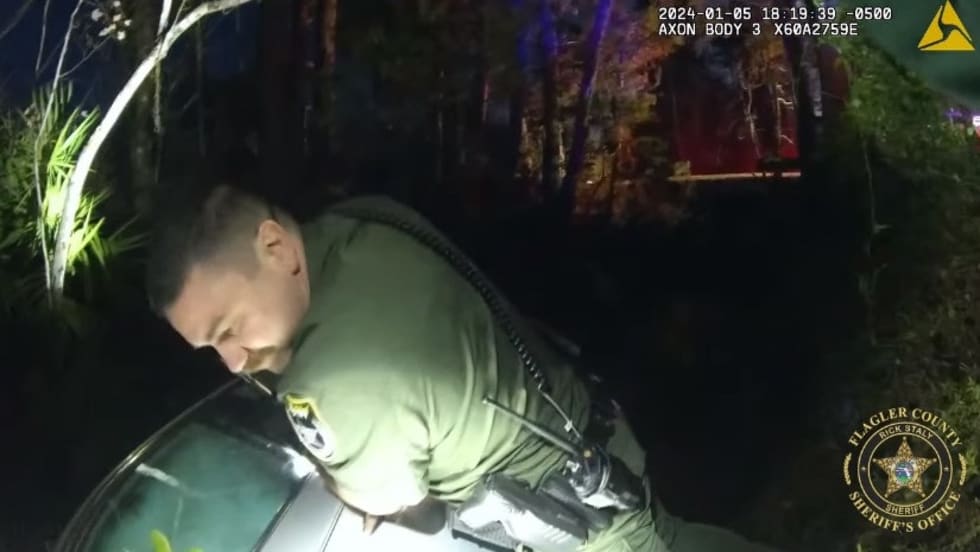 Flagler County So says the deputies arrived to find a dazed and bleeding male outside of the vehicle and noticed that an adult female and small child in a car seat were still trapped inside the vehicle.