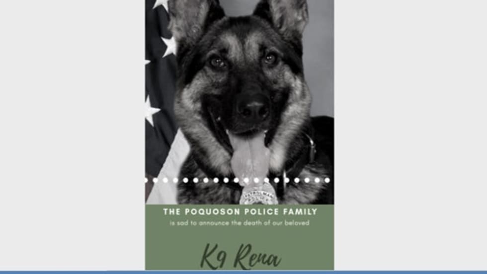 Officers with the Poquoson (VA) Police Department are now mourning the passing of K-9 Rena, who died on Sunday afternoon. The department said Rena's cause of death was "unexpected, but due to natural circumstances."