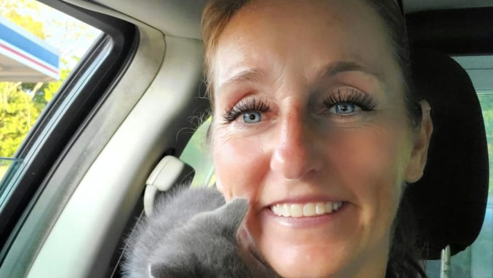 An officer with the Gaffney (SC) Police Department was working the scene of a traffic collision when she heard a tiny little "meow." She shone her flashlight around and discovered a small grey kitten.