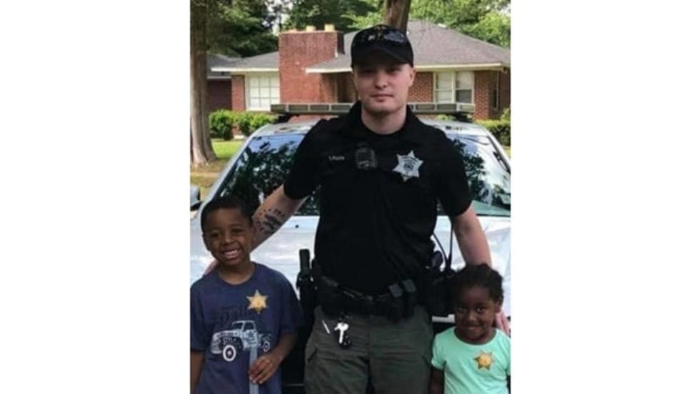 An officer with the South Bend (IN) Police Department was seen over the weekend helping two boys—a 12-year-old and his four-year-old brother—serving refreshments of lemonade, punch, and popcorn to area residents.