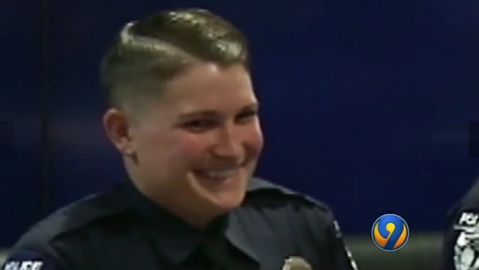 Officer Casey Shue was taken to the hospital after being shot in the leg during an ambush outside of police headquarters Thursday night. She was hired by CMPD in July of 2014.