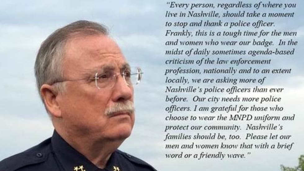 The chief of the Nashville Metro Police Department took to Twitter late last week to plead for citizens to thank a police officer, appreciate the difficulty of their jobs, and understand that despite being fewer in numbers officers are being asked to do more and more every day.