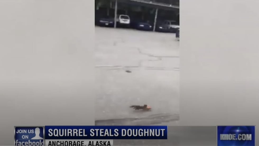 The Anchorage Police Department posted a video online of a squirrel shown against a backdrop of police cruisers allegedly running off with an officer's donut.