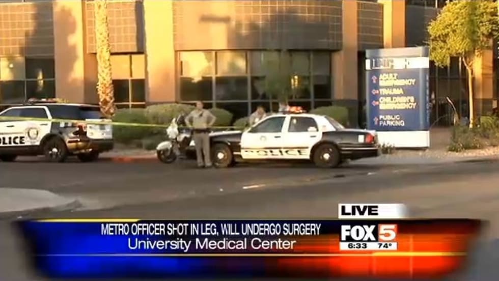 After a more than three-hour manhunt, two people were arrested in connection with the shooting of a Las Vegas Metro police officer Friday morning.