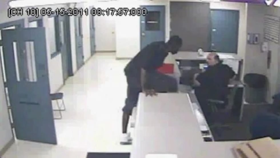 Anthony Thomas, 29, of Cleveland can be seen in footage taken from the station's surveillance cameras leaping over the counter and jumping on the back of Officer William Witt, who is seated working at a computer.