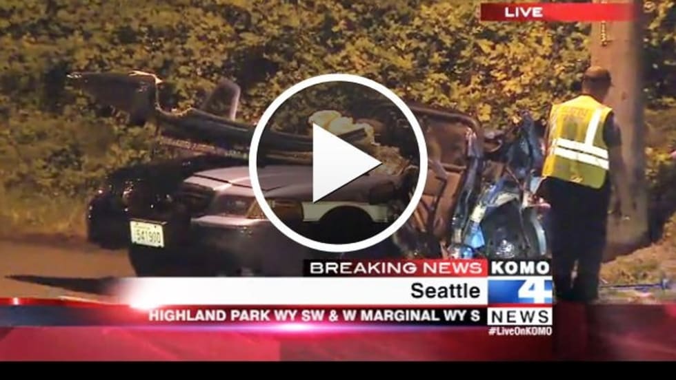 A Seattle police officer was injured and needed to be cut out of his car after a Monday night crash in Seattle's Delridge neighborhood.