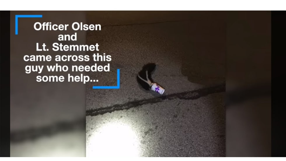 An officer with the Aurora (IL) Police Department managed to help a small skunk with a food container stuck on its head in a brief incident captured on video.
