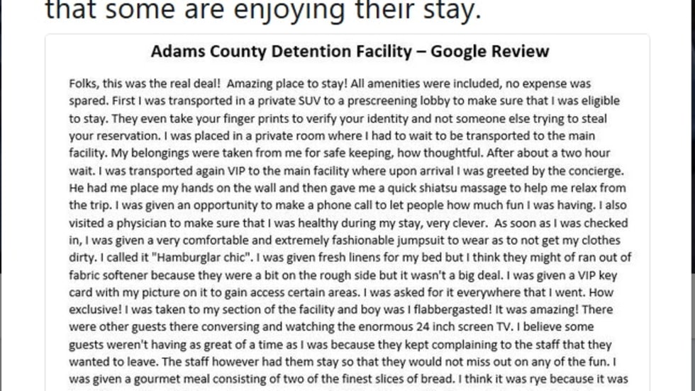 Felipe Martinez recently visited the Adams County Detention Facility in Colorado. arrested after he failed to appear for his speeding ticket court date. Then he wrote a Google review of his stay.