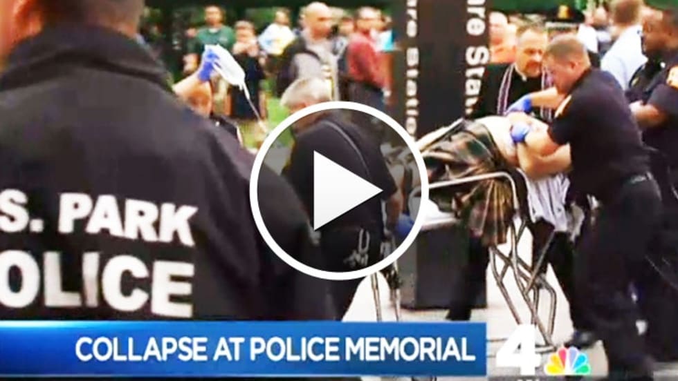 Two officers attending a Police Week ceremony in Washington Wednesday night helped save the life of a police bagpiper who collapsed from a heart attack during the Emerald Society March.