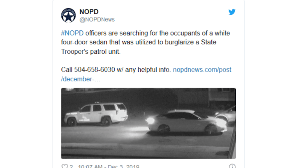 Two people reportedly smashed the window of a Louisiana State Police patrol vehicle and stole a patrol rifle from within the squad car.