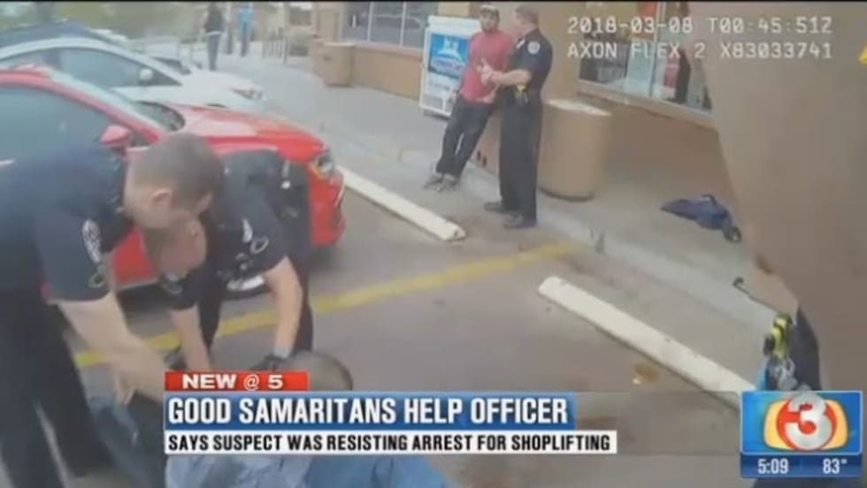 "I stood over his leg and lowered myself down a little to make sure he didn't get his foot up and kick the officer," said Erickson. "We then tried to grab his arm out from behind his back. Once we got his arms out, I asked (the officer) 'do you need me to hold his arms down so you can get your cuffs?'"
