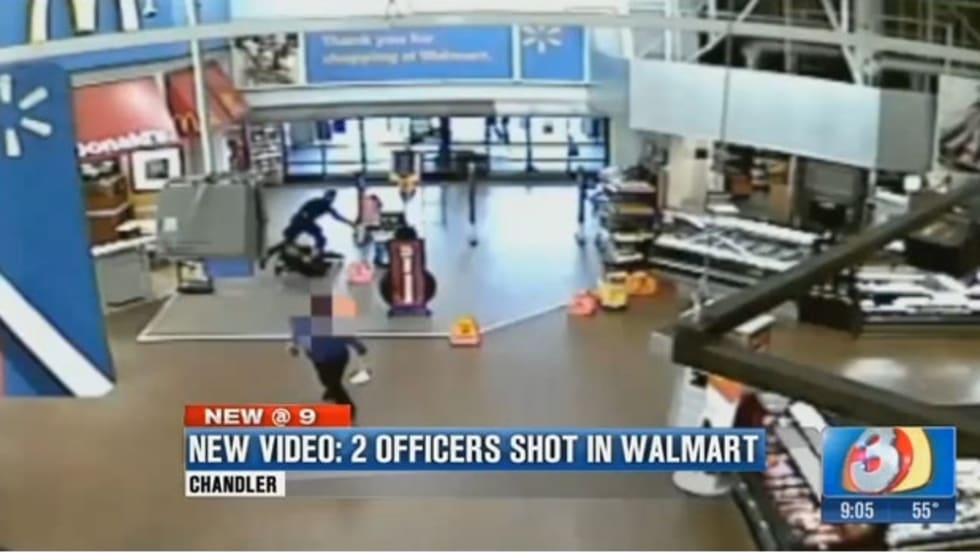 Newly-released surveillance video shows the moment a suspect pulled out a gun inside a Wal-Mart and opened fire on two Chandler police officers, striking both men multiple times.