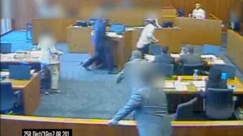 The 24 seconds of video shows Siale Angilau, a member of the Tongan Crips gang, standing up at the defense table, grabbing a pen or pencil, then running to the witness stand and hurtling himself over it.