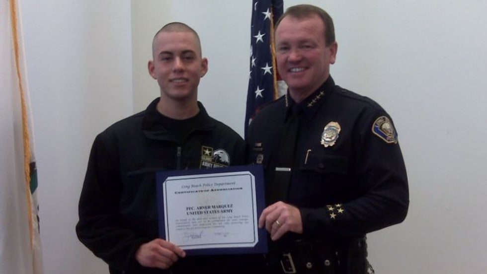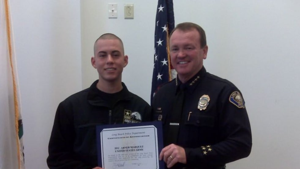 The three Marines and Army private who were about to be deployed to Afghanistan helped the sergeant get the 19-year-old man into custody. Police had responded to a call of a man "brandishing a sharp instrument and threatening citizens."