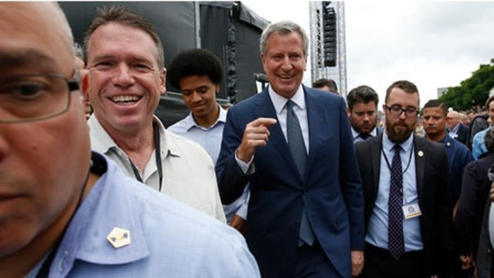 The demonstration of contempt was spurred by the mayor’s excursion to Germany to join anti-Trump protesters at the G20 summit one day after last Wednesday’s execution of 12-year NYPD vet Familia.