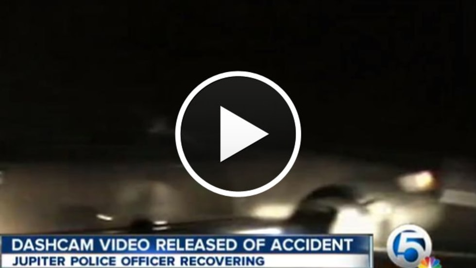 A Jupiter (Fla.) Police officer was injured Sunday when a sleeping driver struck his patrol car, sending him into a tree and rollover crash. Officer Jason Starks was not seriously injured.