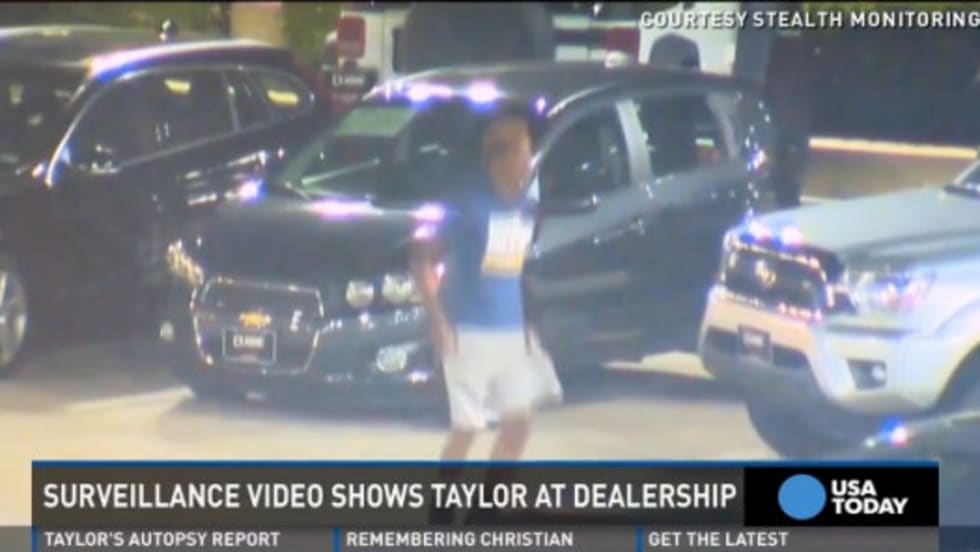 Shortly before a police-officer-in-training fired on a Texas college football player who drove his SUV through a car dealership's glass doors, the man wandered around the lot trying to open locked doors and kicking out one vehicle's windshield, according to surveillance video made available for review Saturday.