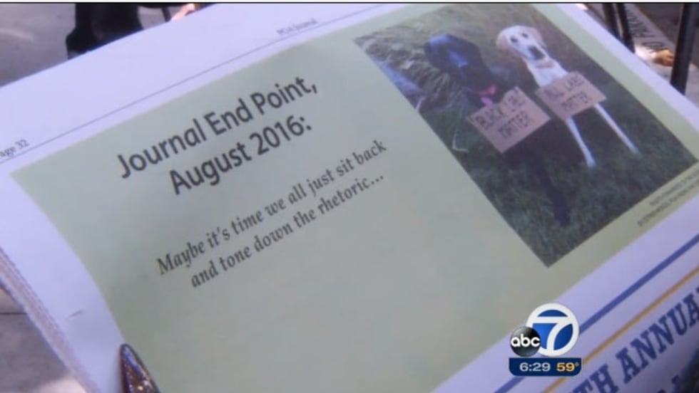 The San Francisco POA’s August 2016 Journal’s “End Point” ad shows a picture of a black lab wearing a sign that says "black labs matter" next to a picture of a yellow lab wearing a sign that says "all labs matter."