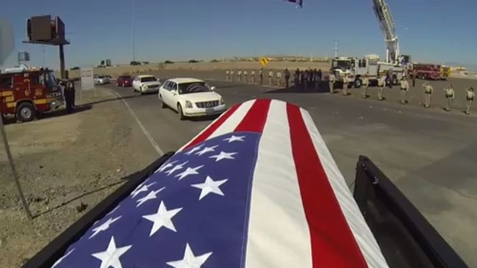 Dozens of police vehicles escorted the body of Las Vegas Metro Police Officer David Vanbuskirk to a Henderson church Monday to eulogize the fallen officer.