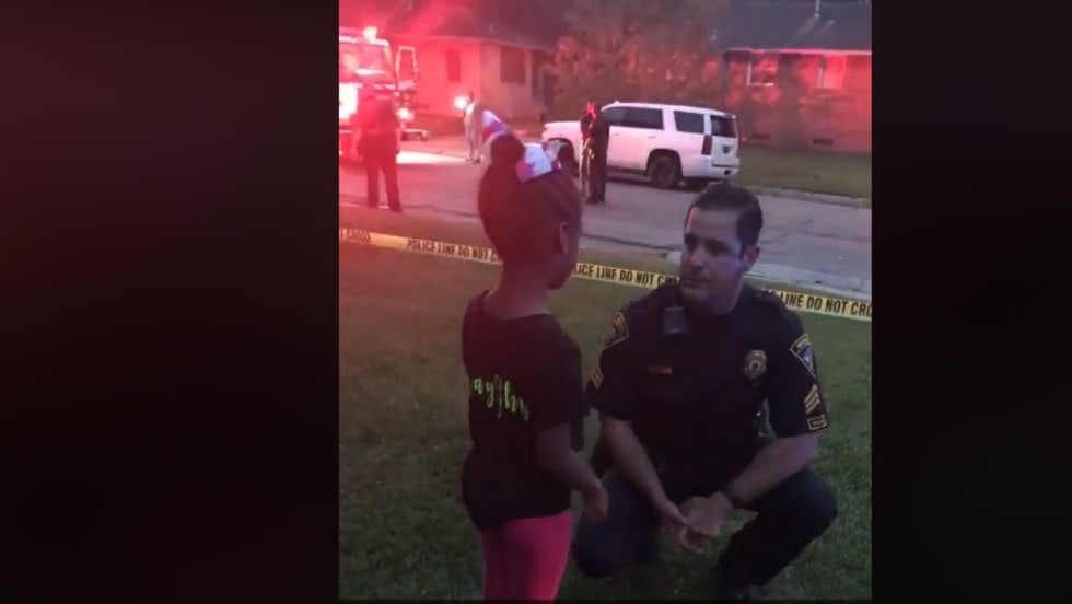 An officer with the Mobile (AL) Police Department was seen in a viral social media video talking to a scared six-year-old girl who had just suffered the loss of her cousin—Justin Mooney—who was killed in the crossfire of a drive-by shooting.