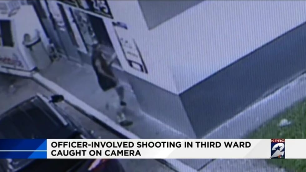 Surveillance camera footage shows the officer shooting at an armed man at a gas station convenience store on Saturday night—the gun then flies from the suspect's hand.