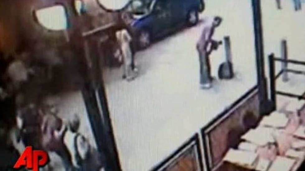 The footage, which is shot from a vantage point inside a nearby restaurant, shows a slender, balding man removing a garment near what appears to be a piece of luggage.