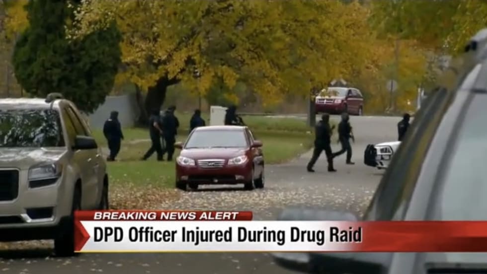 The unidentified officer and others were fired upon around 11 a.m. Saturday as he approached a home with a warrant during a drug raid on the city's west side. Police say flying shrapnel injured the officer's leg when the gunman used a "high-powered weapon" to shoot through a metal door.